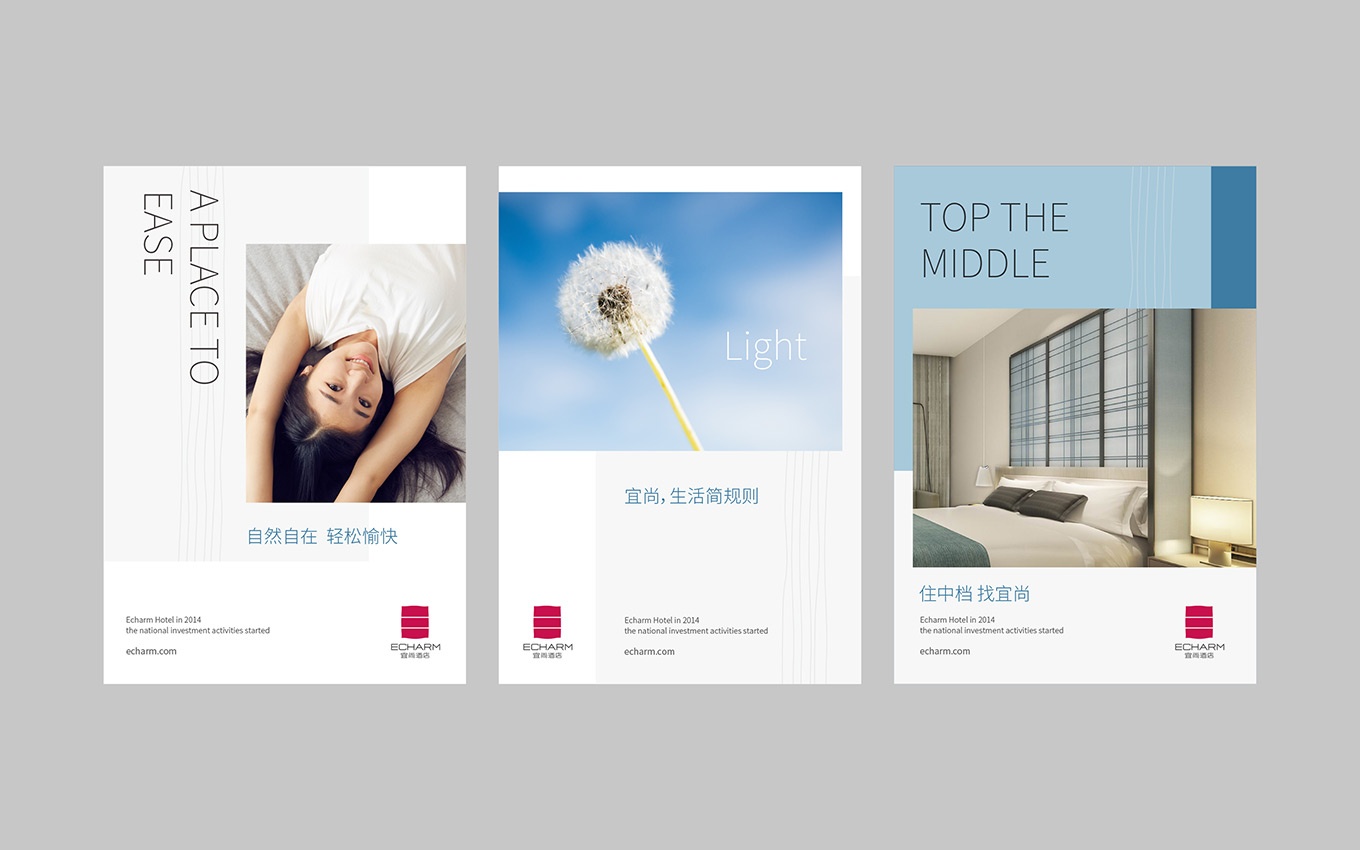 旨在滿足境內外年輕人士的需要,以精致時尚的環境設計、舒適人性的客房設施、便捷高效的商務配套、恰到好處的熱情款待,帶領賓客體驗前所未有的旅行新樂趣。自信而不張揚,和氣但不平庸,環境與人融為一體,平衡之道,盡在宜尚。為宜尚酒店提供中檔酒店vi設計。